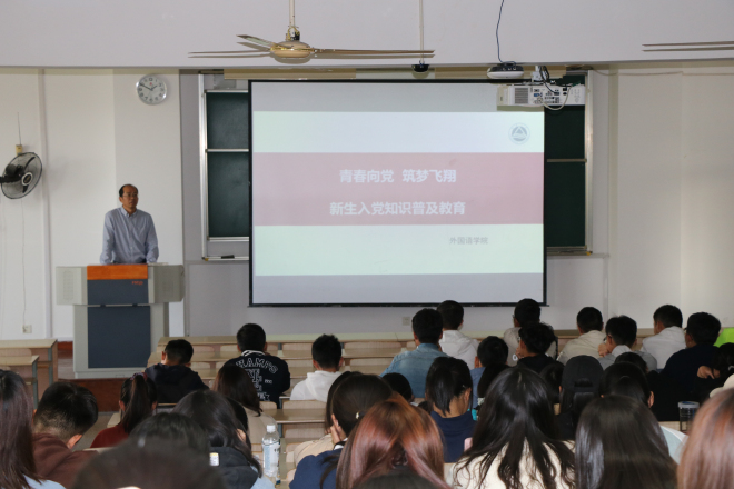 11月11日下午,“青春向党,筑梦飞翔”新生入党知识普及教育在二教2D306举行,外国语学院党委副书记刘伯贤作为主讲嘉宾出席会议,学院2020级新生参加本次会议。
