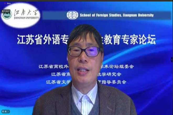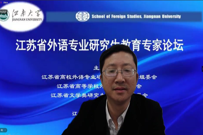 11月25日下午,“江苏省外语专业研究生教育专家论坛”在我校外国语学院举办。本次论坛由江苏省高校外语专业研究生学术论坛组委会、江苏省高等学校外语教学研究会、江苏省文学类研究生教育指导委员会主办,由我校外国语学院承办。论坛采用线上线下相结合的方式,线下参会地点在文科楼A349,线上通过腾讯会议平台进行直播。
