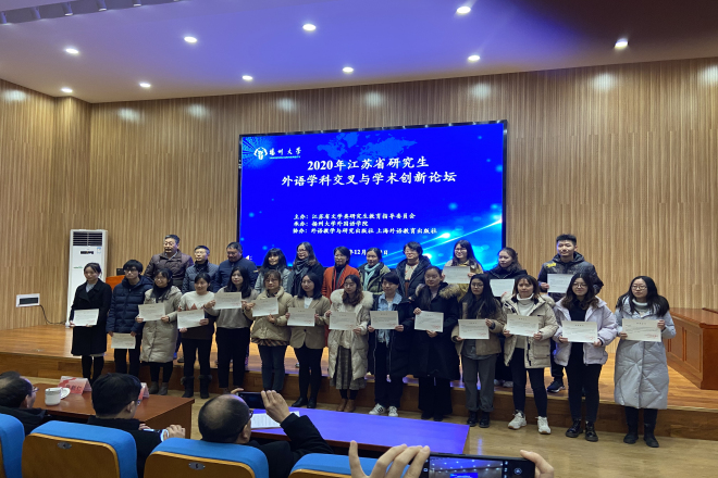 12月19日至20日,江苏省研究生外语学科交叉与学术创新论坛在扬州大学召开。本届论坛由江苏省文学类研究生教育指导委员会主办, 由扬州大学外国语学院承办。来自江苏省及长三角地区20余所高校外国语言文学学科90名博、硕士生与10余位带队老师出席了本次学术论坛。我校外国语学院19级三位研究生向俊蓉,朱春霞,方敏在孙志祥教授的带领下参加了本次论坛。