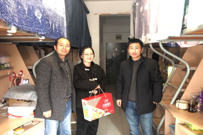 今年寒假期间外国语学院有两名学生因疫情防控、考研学习需求留校。戴月波走进学生宿舍详细询问了学生目前在校的生活、学习情况,表达了学校对于寒假留校学生的关心,并为两名学生送上新春慰问礼包。在得知王宇翔同学留校学习准备考研时,戴月波鼓励他做好学习规划,向榜样看齐,并预祝他考取心仪学校。在和杨雁华同学交流中,戴月波嘱咐在疫情防控期间要按照统一部署,提高防范意识,做好科学防护,留校期间要多与家长电话联系,学习生活中的困难要及时和辅导员老师交流,遇到困难随时向学院反映。交流过程中,刘伯贤表达了学院对于寒假留校学生的关心,同时鼓励大家好好利用寒假时间学习,争取在考研和求职中取得新突破。