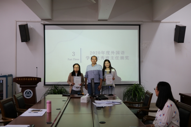 在2020年度外国语学院班主任工作中,徐燕娜、华清、谢瑜三位老师荣获“升学优秀奖”,张良青老师荣获“优秀学风奖”。颁奖后刘伯贤号召学院班主任老师向他们学习,主动提升工作方式方法,不断增强班主任工作能力和工作成效。