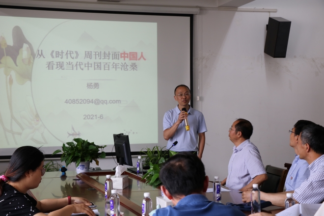 6月4日下午,外国语学院2021外语学科系列讲座之五暨第十五期“遇见更好的自己”名师沙龙在学院A349会议室举行。本次会议邀请阜阳师范大学外国语学院翻译系主任杨勇教授,以“从《时代》周刊封面中国人看现当代中国百年沧桑”为主题进行现场分享。外国语学院党委书记史志洪,外国语学院院长方文开,副院长顾琦一,副院长谢竞贤,江南大学魏取福教授以及多名老师参与了此次讲座。讲座由外国语学院党委副书记刘伯贤主持。