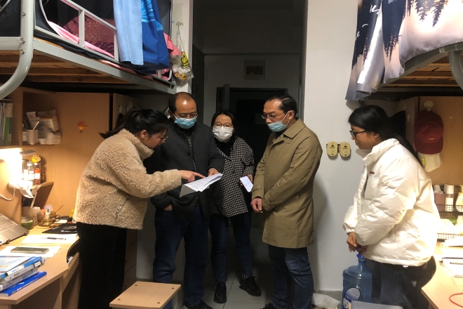 为了给返校的学生带去学院的关心,并及时了解学生的思想动态、学习生活情况,3月22日,外国语学院党委书记史志洪、院长方文开、党委副书记刘伯贤、副院长顾琦一、分团委书记陆芳以及辅导员老师一行来到浩苑、润苑公寓,走访关心学院返校学生。