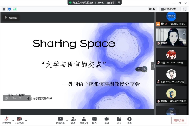 外国语学院“Sharing Space分享空间”是外国语学院在新文科、新外语背景下,旨在为广大外院学子搭建学术、技能等信息分享交流平台。3月26日,“Sharing Space分享空间”邀请外国语学院张俊萍副教授线上参与主讲“文学与语言学的交点”主题圆桌会,会议吸引近百名同学参与线上交流。