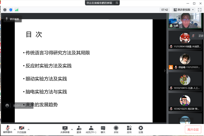 本次圆桌交流会张鹏老师的分享共分三部分。首先是对传统语言习得研究方法及其局限性的介绍。张鹏以传统的问卷调查为例,为我们具体分析了实验语言学的传统研究方法中存在的几个问题,引领同学们直观地了解静态实验数据无法明确语言加工的“过程”、无法区别语言的“理解”和“产出”等局限性。其次是结合实例讲解了当前语言学前沿的主要研究方法。张鹏详细地介绍了三种实验方法,分别是反应时实验方法、眼动实验方法和脑电实验方法。接着又通过几个相关研究实践的讲解来加深同学们对这些实践方法的理解。张鹏专业认真的讲授让同学们对实验语言学的研究方法、基本原理及设计程序有了一定的了解,开拓了学术眼界,受益匪浅。最后,张鹏与同学们一起分析了实验语言学未来的发展趋势,并发出了“科研时疫,共克时艰”的号召。
