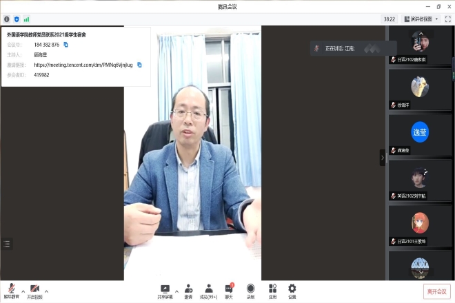 同日晚上,外国语学院党委副书记刘伯贤召开了2021级本科生会议,刘伯贤号召大家积极高效地进行线上学习。面对疫情的严峻考验,同学们应服从疫情指挥要求,听从学校安排,及时测温上报。他还鼓励同学们多参加锻炼,保持良好的体魄和健康的精神状态。刘伯贤传达了学院关于教工党员联系宿舍的相关规定,逐一介绍了党员教工的情况,告知每位学生遇到思想、学业、心理、职涯规划等问题都可以咨询宿舍导师,鼓励学生加强与老师的沟通和交流。