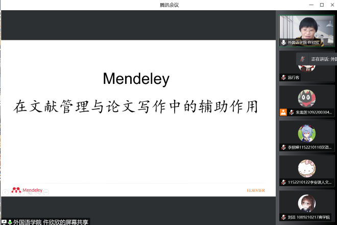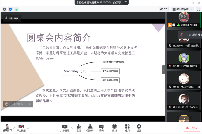 4月6日下午,Sharing space分享交流圆桌会第四期邀请外国语学院仵欣欣教授线上主讲“文献管理工具Mendeley在论文管理与写作中的辅助作用”,会议持续近一小时,来自各个学院的120余名同学线上参与,共同了解学习Mendeley。