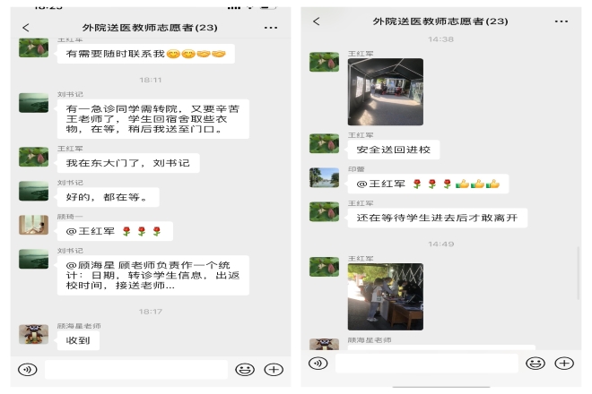 下午6点,志愿者群里发出急诊消息“有一名急诊同学需要转院”“收到,马上来”,刘伯贤发出消息后,王红军从家里快速出发,前往学校东门接应。“我在东大门了”。因为是急诊,需要办理手续后才能出校。刘伯贤陪同学生办理完手续后,王红军在门口将学生接送到医院就诊。晚上22点多,王红军在群里反馈“还有15分钟左右到达东门”“好的,已在东门”。学生达到东门,叮嘱过后王红军带学生进行信息登记,刘伯贤将学生接到长广溪。“学生已经在长广溪住下了,大家放心”。志愿群里是大家对学生需求的快速响应,从“收到”到“放心”,老师志愿者通过持续接力,形成关爱守护“闭环”。