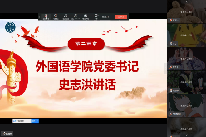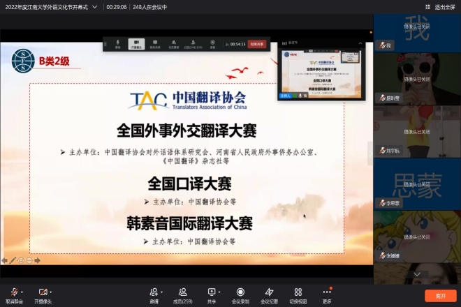 5月11日,江南大学2022年外语文化节开幕式暨“栩栩如声”配音大赛决赛在线上举行。外国语学院党委书记史志洪、校学生工作部(处)副处长俞立峰、外国语学院分团委书记陆芳等出席本次活动,外国语学院全体大一、大二学生线上参会。