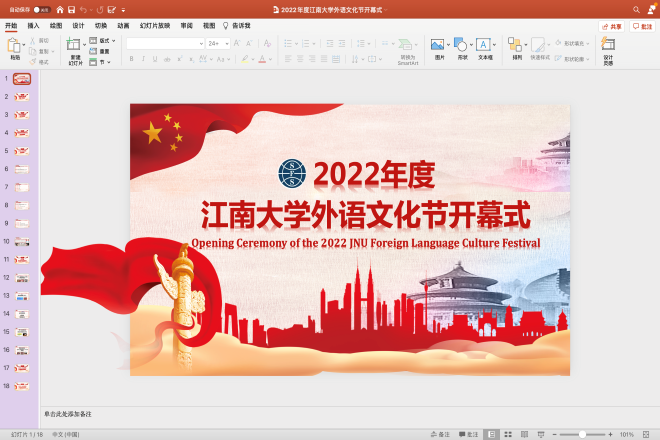 接着,史志洪讲话并宣布开幕。史志洪表示,江南大学外语文化节是加强校园文化建设的阵地,是提升学生专业素质和营造良好学习氛围的有效载体。2022年是中国共产主义青年团成立一百周年,新时代青年应当“笃行不怠,奋发向上”,在新的征程中留下属于自己的青春印记,以闪光的青春迎接党的二十大胜利召开!