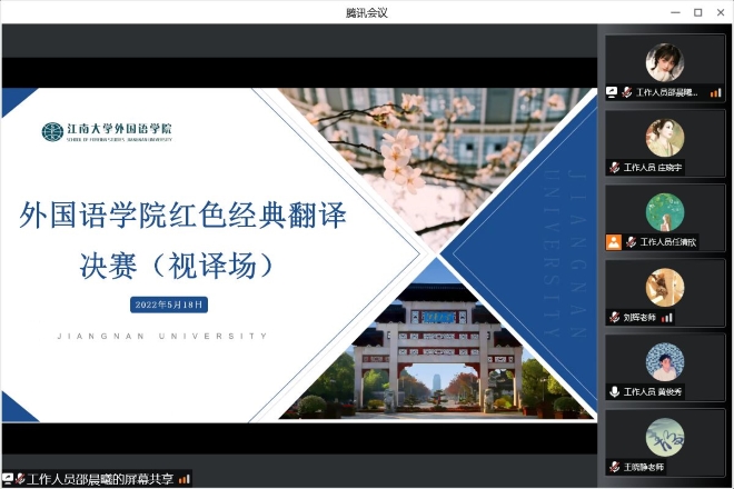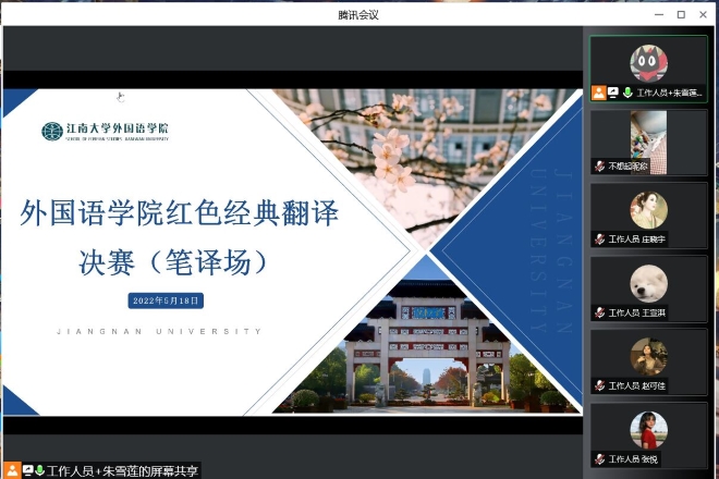本次红色经典翻译大赛分为线上初赛和线上决赛两部分。前期经过自主报名,全校共有100余名学生报名参加。4月7日经过线上初赛后,选拔36名同学参加最终决赛。5月18日下午在线上举行决赛,决赛分为笔译和视译两个环节,邀请撒忠清老师、王晓静老师、刘辉老师担任评委。本次笔译和视译的试题均从《中国共青团团史》《中国共产主义青年团90年》《共青团书系》《中国共青团年鉴》《中国共青团史稿》等红色经典著作中选取,旨在让学生重温红色经典,激励青年人用奋斗和拼搏汇聚蓬勃力量,坚定对中国特色社会主义的信念、对共产主义的信仰,同时以赛促学培养学习热情,提升翻译专业能力。