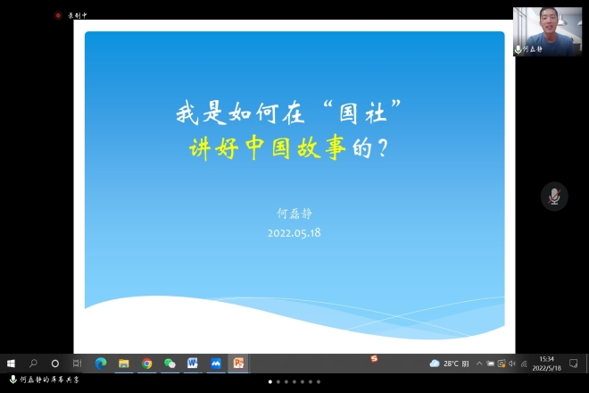 5月18日下午,外国语学院线上举办“如何在‘国社’讲好中国故事”线上分享会,分享会邀请外国语学院2011级、现供职于中央媒体新华社的何磊静为大家线上分享,会议由英语系副主任杨昊老师主持。