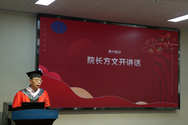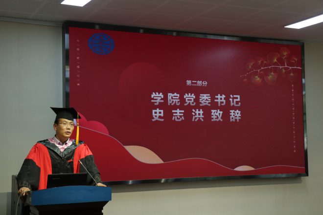 典礼伊始,学院党委书记史志洪致辞。史志洪首先代表学院党委向全体毕业生表示热烈的祝贺和美好的祝福,向老师与家长致以崇高的敬意和衷心的感谢,并对同学们提出了三点希望:一是胸怀大局,不断增加人生的高度;二是求真务实,不断增加人生的宽度;三是追求卓越,不断增加人生的厚度。最后祝愿所有毕业生们扬帆起航,开启美好新征程。