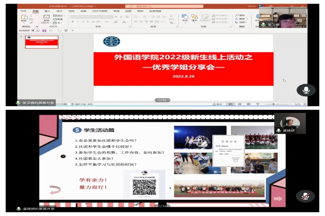 8月26日晚上7点,面向新生组织线上优秀学姐分享会,会议邀请研究生支教团成员邹卫娟、校十佳青年学生盛晓妍分享青春故事。首先,研究生支教团成员邹卫娟同学分享了自己作为班级团支书、学生党支部书记的工作体会,介绍了自己加入研究生支教团后开展的相关工作以及目前在支教地的支教感悟,在谈到支教团时,邹卫娟说:能够参加西部计划是一件很自豪而且意义重大的事情,希望自己可以在支教的一年里,贡献自己青春力量。接着,获得校十佳大学生的盛晓妍同学分享了奋斗故事。盛晓妍同学以互动问答的方式进行分享,通过新生抽问题“盲盒”的方式分享自己的大学经历和感悟,在分享中她鼓励新生在大学期间确立自己的奋斗目标并付诸实际行动,即使遇到了一些挫折,也要坚持下去,要相信自己,不要轻易放弃。