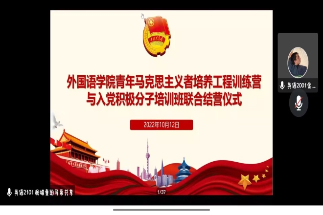 10月12日下午,外国语学院2022年度青年马克思主义者培养工程训练营暨入党积极分子培训班结营仪式通过腾讯会议顺利举行。学院党委副书记刘伯贤、分团委书记陆芳出席会议,全体营员参加了此次会议。