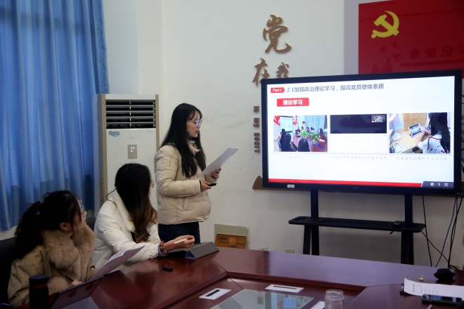 英语本科生党支部书记孙康杰、日语本科生党支部书记鲁颖洁、翻译方向研究生党支部书记马仁芳、文学方向研究生党支部书记张羽洁、语言学方向研究生党支部书记刘澍蕾5位同志借助PPT详细地从个人履职情况、支部组织建设、组织生活开展情况等方面总结汇报了过去一年支部党建工作的成果以及存在的不足,并提出了下一年整改落实思路和具体措施。