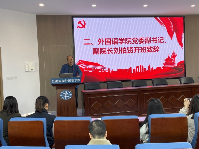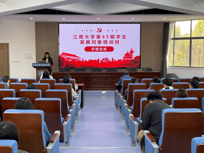 为全面贯彻落实党的二十大精神,提升入党积极分子的党性修养,端正入党动机,坚定理想信念,3月29日下午,江南大学第45期学生发展对象培训班外国语学院、人工智能与计算机学院、法学院分党校开班仪式在外国语学院君金报告厅顺利举行。外国语学院党委副书记、副院长刘伯贤,人工智能与计算机学院辅导员戴士焱出席了本次开班仪式,会议由外国语学院分团委书记陆芳主持。
