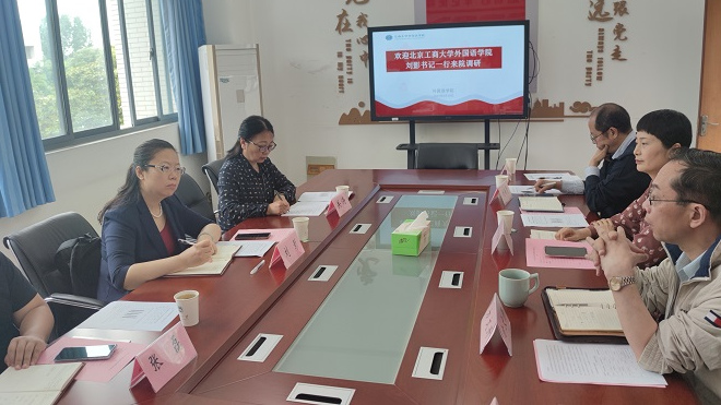 刘影对学院的热情接待表示感谢,并介绍了北京工商大学外国语学院的基本情况;关涛主要介绍了学院国际合作办学和MTI建设相关工作。