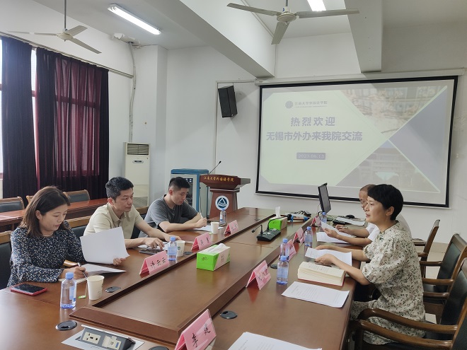 6月13日下午,无锡市政府外事办公室(市外办)秘书处副处长蒋勇、亚太处副处长杨帆、市外事翻译中心主任许云云一行来外国语学院调研交流。外国语学院党委书记李荣华、副书记刘伯贤、外宣翻译团队负责人杨勇等参加座谈交流。