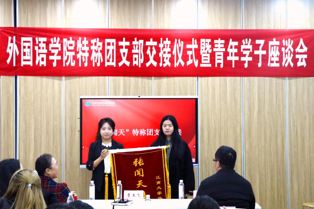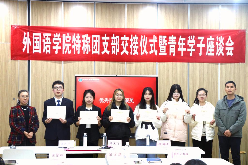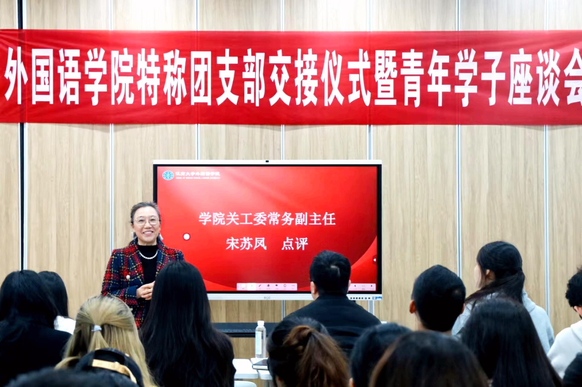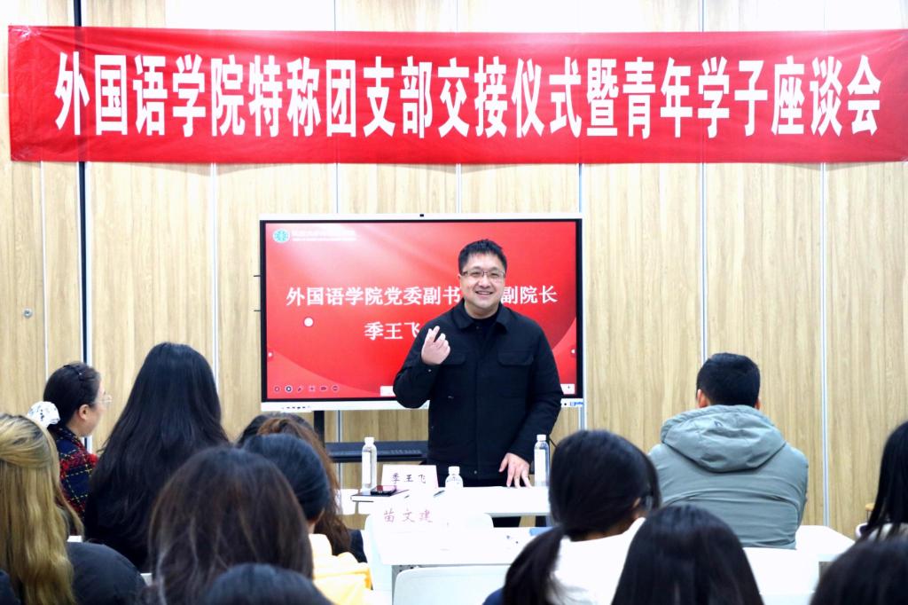 为赓续先辈精神、传承榜样力量,12月6日下午,外国语学院特称团支部交接仪式暨青年学子座谈会在南区一站式学生活动中心顺利举行。外国语学院党委副书记、副院长季王飞,外国语学院关工委常务副主任宋苏凤,外国语学院分团委书记顾海星,辅导员苗文建、朱家烨以及学生会主席团代表李烽毅出席了本次活动,22级、23级及24级学生代表也参与其中。