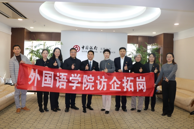 为全面深化院企合作,实现供需对接,拓展毕业生就业渠道与就业岗位,全力促进毕业生高质量充分就业,1月15日,外国语学院党委书记李荣华、党委副书记、副院长季王飞、副院长顾琦一、分团委书记顾海星、辅导员苗文建以及学生代表前往中国银行无锡分行、新东方无锡学校开展访企拓岗促就业专项行动。