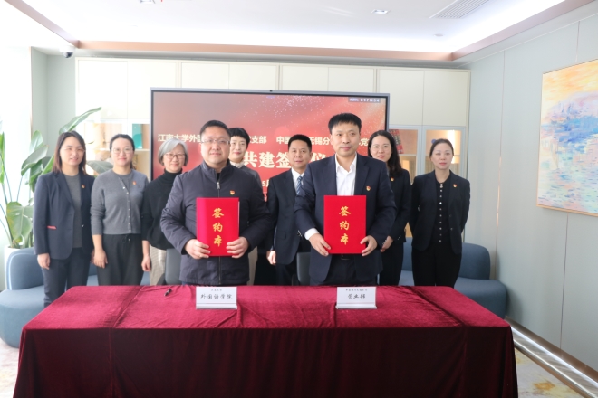 中国银行无锡分行副行长刘志红、个人数字金融部副主任兼营业部副主任怀悦、个人数字金融部副主任华丽莉等参加活动。外国语学院领导老师一行在刘志红副行长的陪同下参观了中国银行无锡分行营业部大厅、跨境金融中心、行史馆等场所。座谈交流环节,刘志红对外国语学院领导老师一行的到来表示热烈欢迎,并介绍了中国银行无锡分行的发展历程、党建工作以及就业招聘等。李荣华介绍了学院发展概况、党建工作、人才培养等,表示学院党委持续加强党支部规范化、标准化建设,以高质量党建推动学院各项事业高质量发展。期待双方以党支部合作共建为契机,在校企资源共建共享、产教融合协同育人方面开展深入合作。最后,外国语学院行政党支部书记季王飞与中国银行无锡分行营业部党支部书记周荣进行支部共建签约。