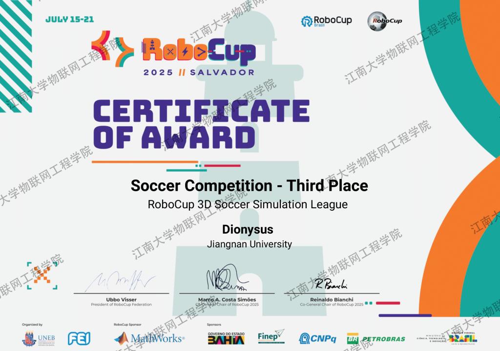 近日,2025年RoboCup机器人世界杯在巴西成功举办。物联网工程学院Dionysus团队荣获2025年RoboCup机器人世界杯3D Soccer Simulation(仿真三维组)季军,追平了中国高校队伍在该组别近十年来的最佳成绩。