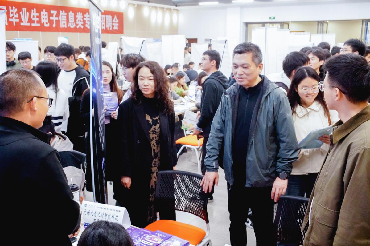 物联网工程学院党委书记张华、党委副书记吴妍,人工智能与计算机学院党委副书记王莉莉、集成电路学院党委副书记糜海燕等深入招聘会现场,与多家企业代表进行了深入交流,详细询问了今年的招聘计划、岗位需求以及对学校人才培养的反馈建议,并对各用人单位长期以来对学校就业工作的支持表示衷心感谢。随后,他们与正在积极求职的毕业生们亲切交谈,了解他们的求职进展与职业规划,并鼓励大家树立信心,把握机遇,争取找到理想的工作岗位。