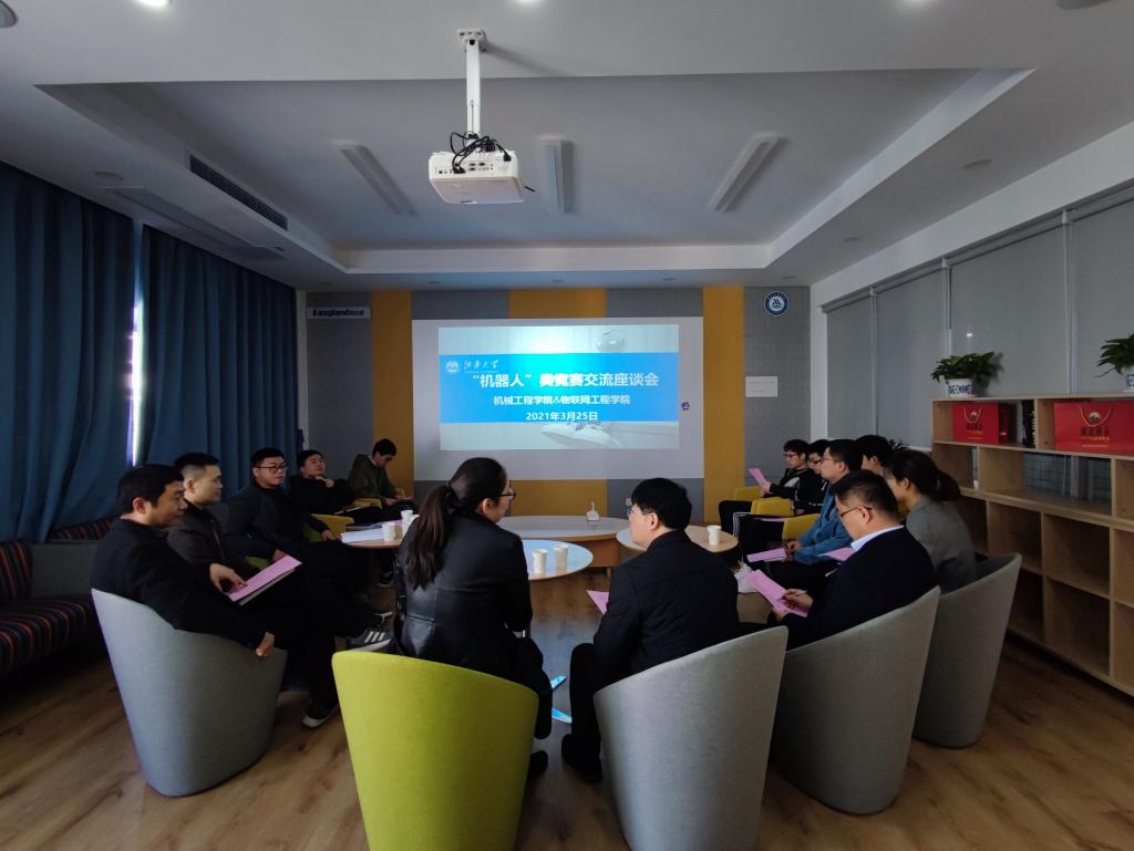 近日,学校“机器人”类学科竞赛交流座谈会在机械工程学院毅合捷厅召开。机械工程学院党委副书记、副院长方俊,物联网工程学院党委副书记、副院长孔丽丹,机械工程学院分团委书记孟召双,物联网工程学院分团委书记吴垚,分管学科竞赛条块工作的辅导员、竞赛指导教师和机器人俱乐部学生代表等参加活动。会议由机械工程学院辅导员孟飞主持。