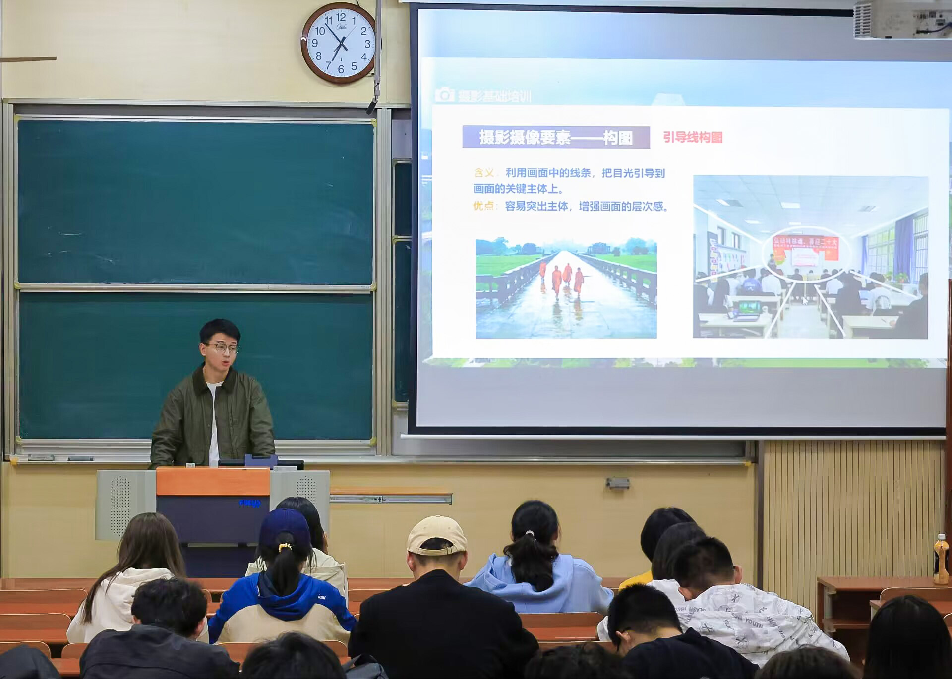 曾磊系统介绍了摄影摄像的基础知识,从基本工具到各类设备的特点和适用场合,并强调了景别和构图的重要性,指出拍摄时应先明确主体再确定景别和构图。同时,他结合丰富的实践经验,深入剖析了“活动摄影”和“会议摄像”的拍摄准备、时机把握、拍摄技巧和注意事项等,使同学们对摄影摄像应用与实践有了更深入的认识。在实践操作环节,他积极互动,现场指导同学们操作相机,感受不同参数的拍摄效果。最后,他鼓励同学们要勇于探索、持续学习,日常工作中要加强实践操作训练,以不断提升宣传工作质效。