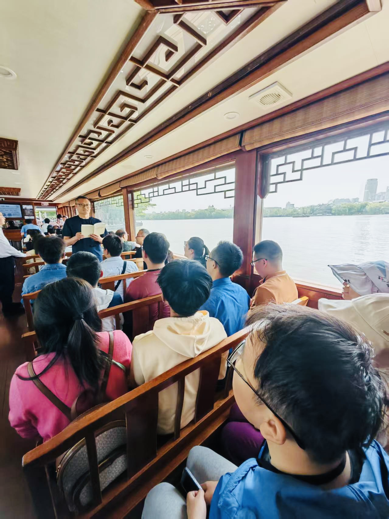 随后,师生一行前往南湖会景园,循着一大代表的足迹乘船至湖心岛,途中教师第二党支部书记巩凯现场领学《习近平关于加强党的作风建设论述摘编》部分内容,呼吁全体党员“以红船精神为镜,以八项规定为尺,做到心有所畏、言有所戒、行有所止”,全体党员开展“边走边学”交流讨论。