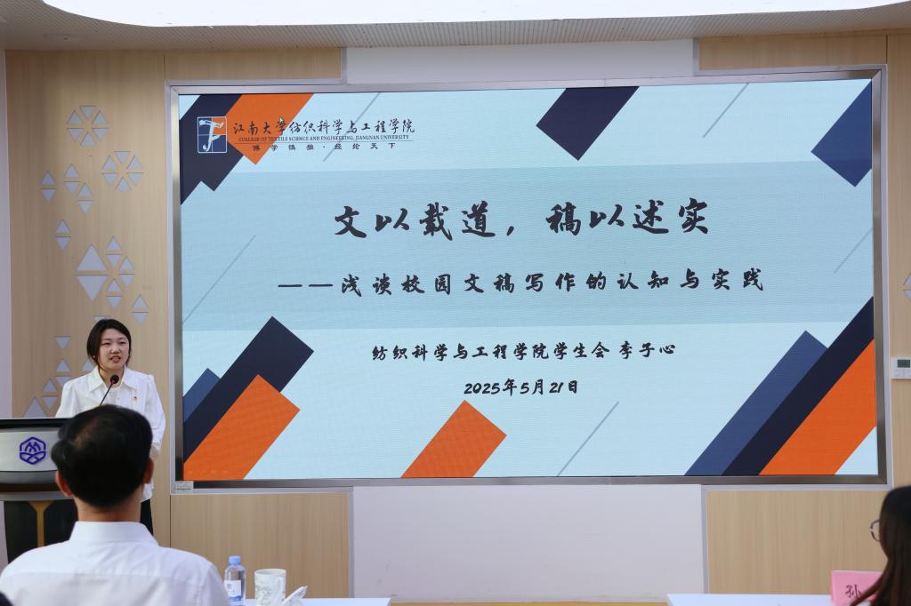 为提升学生骨干新闻素养,本次培训班邀请纺织科学与工程学院学生会执行主席李子心作《文以载道,稿以述实——校园文稿写作的认知与实践》主题分享。李子心从公文基本认识、文稿写作特点以及常见问题解析三个维度,向学生骨干深入浅出地分享了校园文稿的写作规范与宣传技巧,有利于学生骨干更有质量地讲好生科院故事,传递江南好声音。