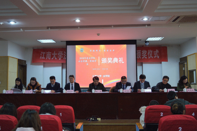 1月9日,法学院2018年度“社会奖教、奖学助学金颁奖典礼”于文浩馆205会议室成功召开。江苏海辉律师事务所合伙人许雪松律师、杜一律师、朱佳丹律师,无锡市新吴区社会工作协会王文进秘书长、彭颖(项目负责人),君澜(无锡)律师事务所创始人瞿俊鹏律师、任华律师、张咪律师,法学院党委书记杨杰、党委副书记张慧琪、副院长王君柏及师生代表近200人参加了本次典礼。颁奖典礼由张慧琪主持。