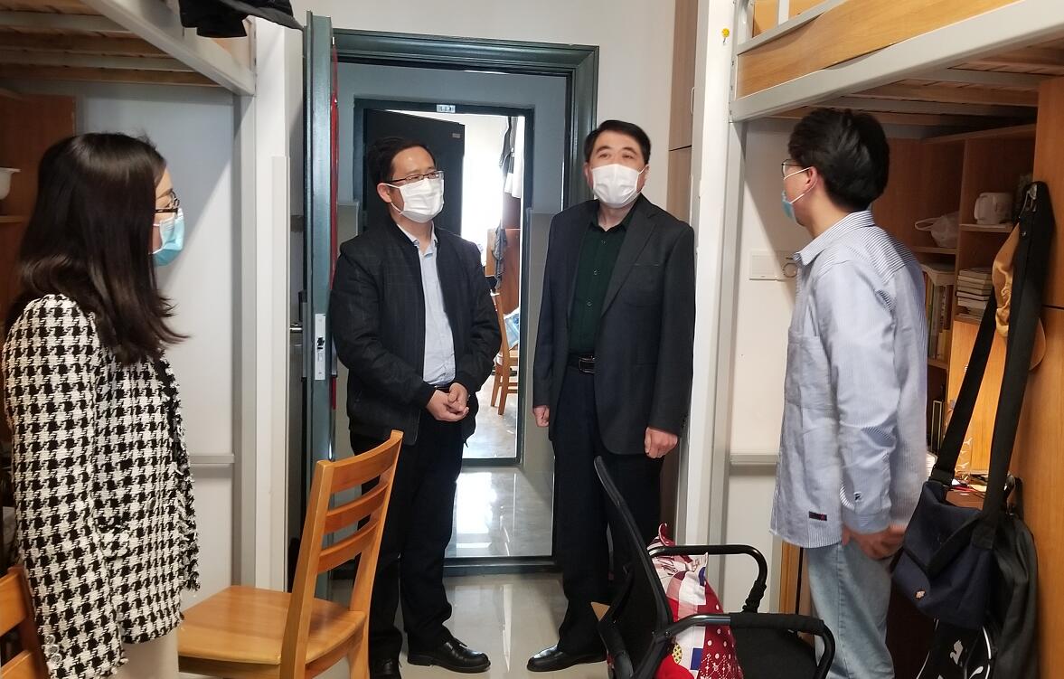 4月20日-22日,法学院第一批55名本硕学生陆续返校,22日上午,法学院党委书记杨杰,副院长(主持工作)王君柏,副书记张慧琪,分团委书记胡博,辅导员冯亚东、帕日旦木一行走访学生宿舍,为返校学生送上亲切的问候和暖心的关怀。