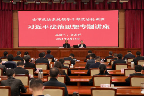 3月15日,无锡市政法系统举办习近平法治思想专题讲座。此次讲座作为江南大学法学院与无锡市委政法委、无锡市司法局共同设立的“法治无锡•市域社会治理现代化研究院”成立以来举办的首次大型专题讲座,副市长、市委政法委副书记、市公安局局长、全市政法队伍教育整顿领导小组副组长刘必权主持并讲话,省政法队伍教育整顿驻点指导组副组长陈旭,市中级人民法院院长钱斌,市人民检察院检察长朱良平出席专题讲座。讲座以电视电话会议形式举办,各市(县)区在分会场收听收看专题讲座。