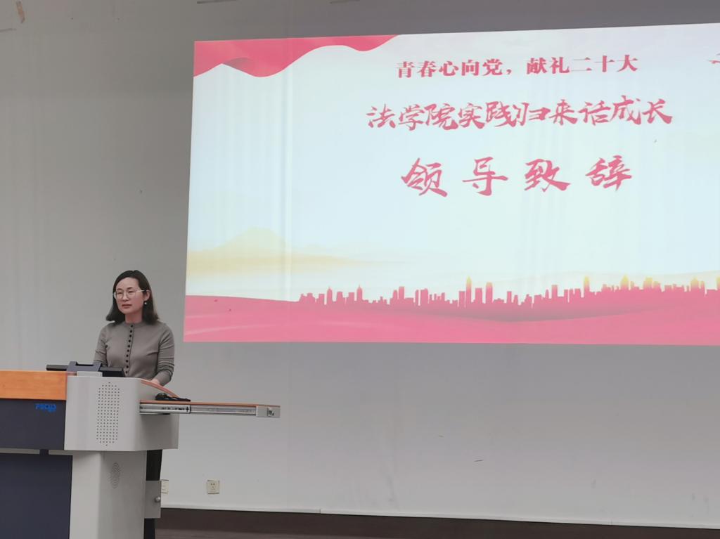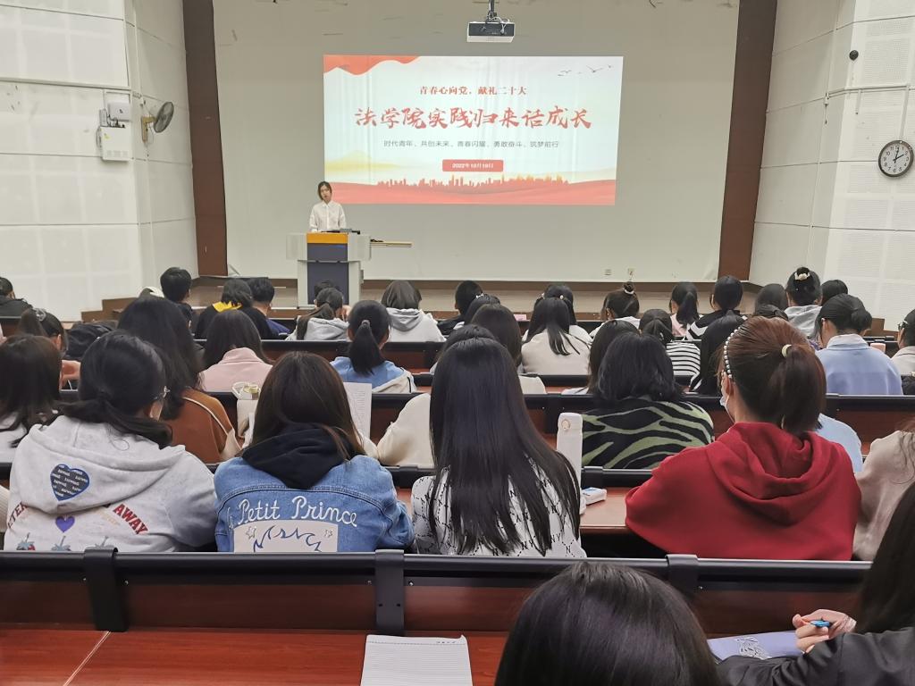为充分展示社会实践优秀成果,引导广大青年学生有理想、有担当、肯吃苦、能奋斗,法学院于10月19日下午,举办“青春心向党,献礼二十大”法学院2022年“实践归来话成长”暑期社会实践成果汇报会。院党委副书记、副院长张慧琪,分团委书记徐雅静、辅导员缪晶晶出席会议,全体2022级新生参与此次活动。