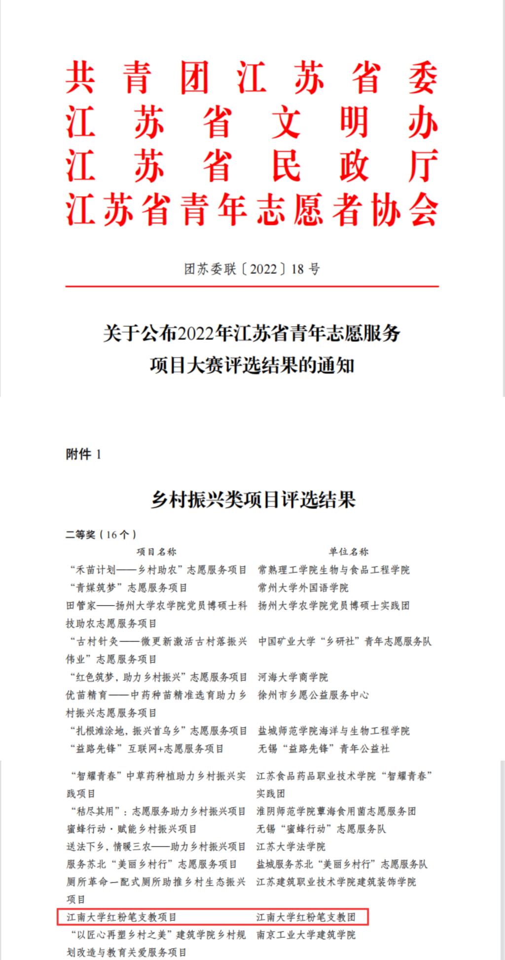 近日,由共青团江苏省委联合省文明办、省民政厅、省青年志愿者协会等单位共同开展的2022年江苏省青年志愿服务项目大赛暨第六届中国青年志愿服务项目大赛江苏省选拔赛结果揭晓,江南大学法学院“红粉笔支教团”志愿服务项目获江苏省青年志愿服务项目大赛二等奖。