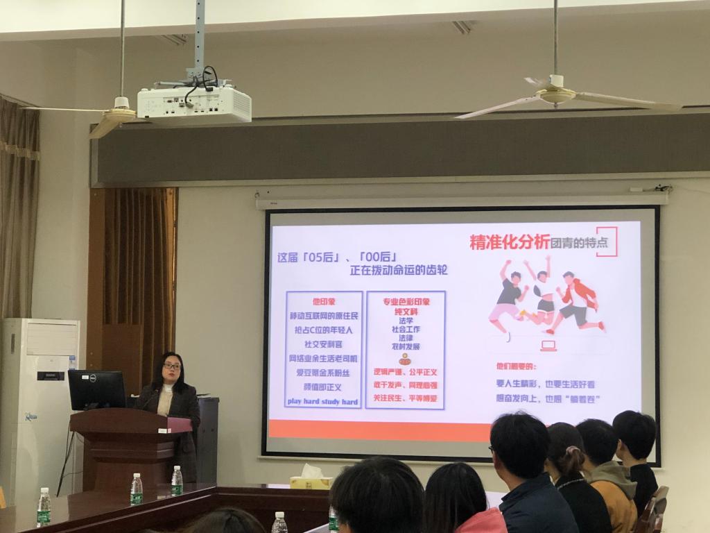首先,徐雅静代表法学院分团委对华庄街道党团工作的领导和基层青年代表表示了欢迎。她说,自今年法学院与华庄街道建立校外实践活动基地以来,学院利用法学、社会工作学科优势,以资源共享、人才共育、基地共建开展20余次专题活动,不断推动校地深入融合发展,取得良好效果。随后,徐雅静从“引领青年、凝聚青年、服务青年”三个角度具体介绍了学院分团委工作,分团委立足学科、突出特色,以3个品牌项目牵引,围绕专业提升力、实践推动力、服务责任力,做好团员青年“赋能”文章。