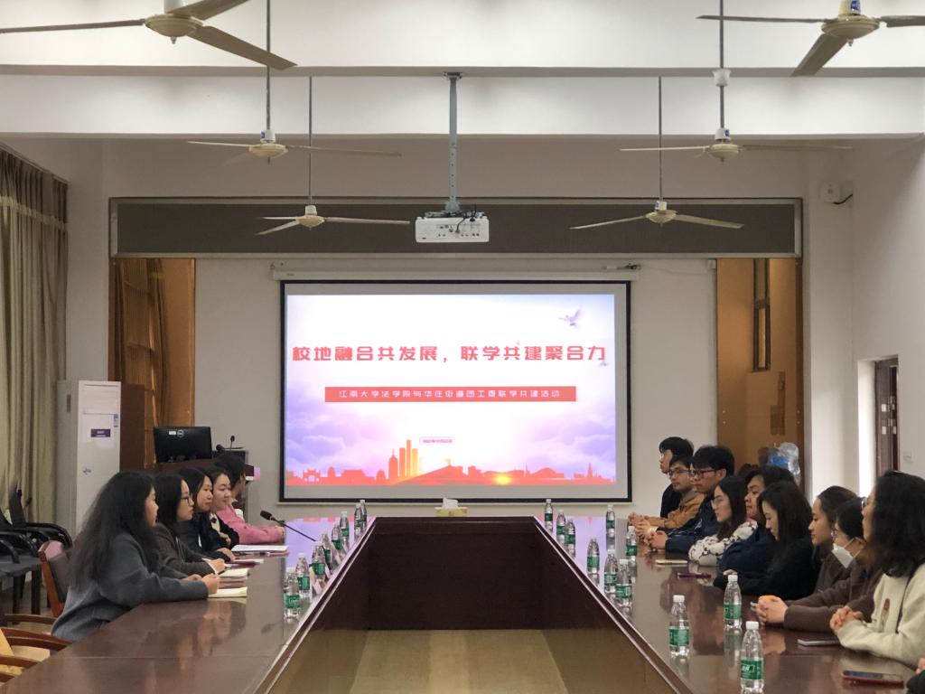 为进一步学习贯彻习近平新时代中国特色社会主义思想和党的二十大精神,增强校地融合,进一步凝聚青春力量,助力社会基层治理。江南大学法学院分团委与华庄街道团工委于11月22日下午开展“校地融合共发展,联学共建聚合力”共建签约活动。江南大学法学院分团委书记徐雅静,华庄街道党建工作指导站站长薛菲,华庄街道团工委副书记沈晴娴出席活动,街道基层青年代表、法学院学生代表参加活动。