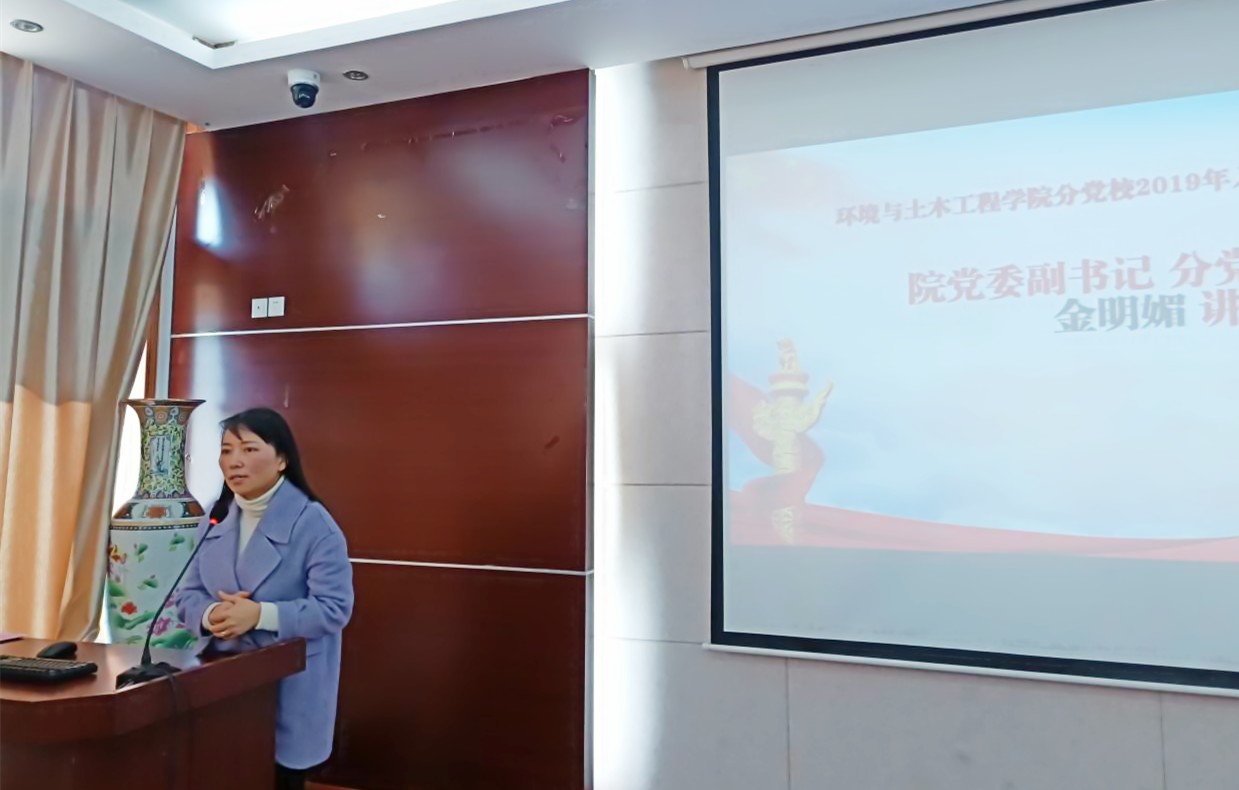 2019年12月4日,环境与土木工程学院分党校2019年学生入党积极分子培训班结业典礼在学院楼D303会议室举行。院党委副书记兼副院长、分党校副校长金明媚,本科生土木专业党支部书记、辅导员薛羚伟以及全体学员出席本次典礼。培训班班主任、辅导员何涛主持典礼。
