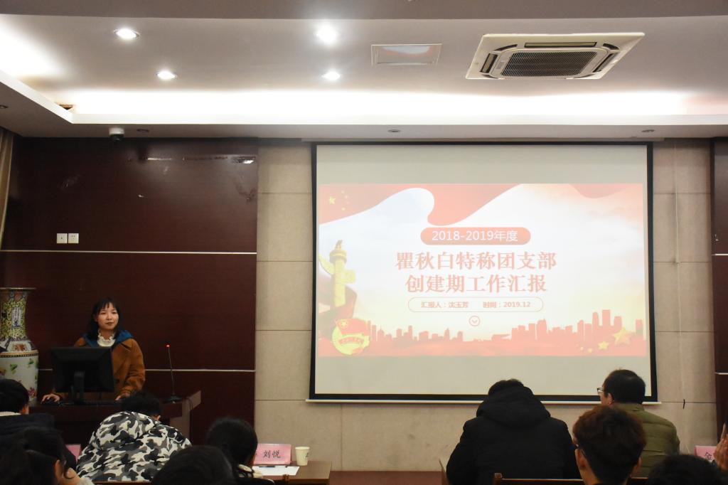 蒋达锋介绍了学院特称团支部建设情况。土木1701班茅以升特称团支部、环工1701班瞿秋白特称团支部进行创建成果展示。两个特称团支部在为期一年的特称创建期内,在支部建设各方面取得了良好成绩,达到创建要求。