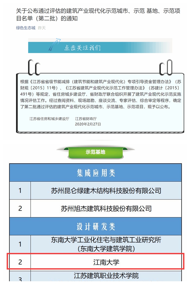 2月27日,江苏省住房和城乡建设厅、江苏省财政厅公布的通过评估的建筑产业现代化示范城市、示范基地、示范项目名单(第二批),经过2016—2019年四年的建设,江南大学获批江苏省装配式建筑设计研发类示范基地,该项目由环境与土木工程学院邹昀教授主持。