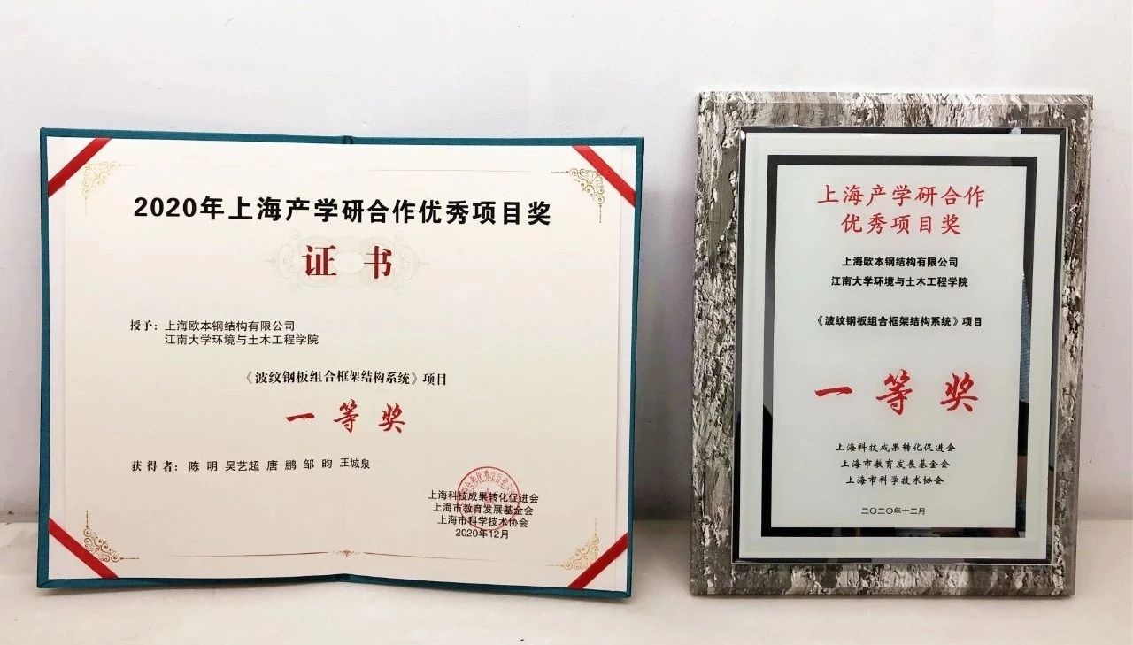 此次评选中,江南大学环境与土木工程学院和上海欧本钢结构有限公司合研发的波纹钢板组合框架结构系统(又名“捷约”系统)获得一等奖。上海产学研合作优秀项目奖”是经市科委批准,由上海科技成果转化促进会(科促会)、上海市教育发展基金会和上海市促进科技成果转化基金会共同设立,由科促会承办的奖项。本次产学研合作项目评选共推出了28个获奖项目,其中特等奖2名,一等奖4名,二等奖7名,三等奖15名。该奖项报国家科技委备案,是上海市最重要的科技评奖之一。