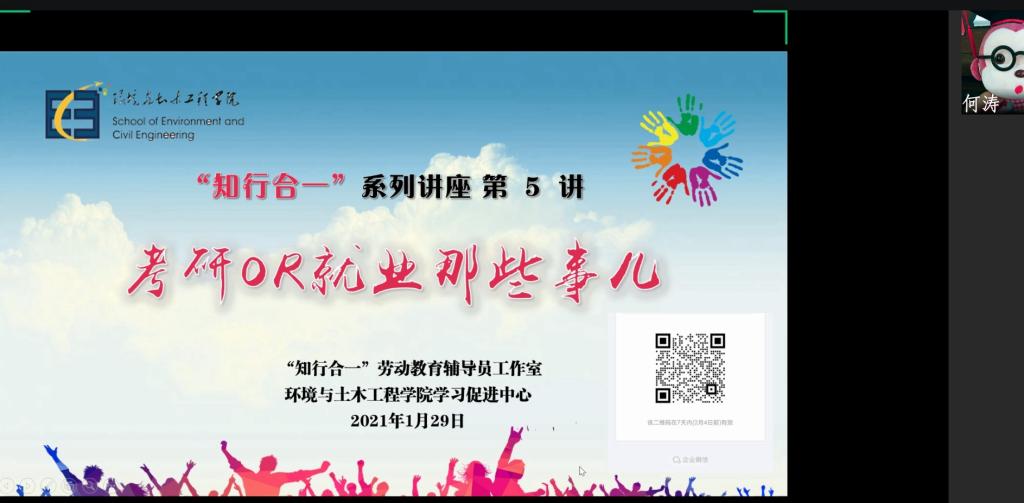 为提高2018级学生大学生涯规划意识,1月29日下午,在前期汇总每位同学考研与就业意向的基础上,江南大学环境与土木工程学院利用线上平台召开2022届毕业生考研就业动员大会暨“知行合一”系列讲座第5讲——考研OR就业那些事儿,帮助同学们尽快明确未来规划。本次讲座由学院分团委书记周佳赟主持,土木工程专业辅导员何涛主讲,2018级全体本科生参与。