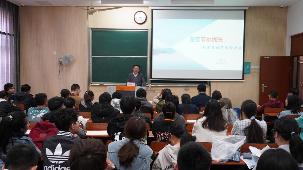 讲座伊始,石亚东从宏观层面介绍了我国的水资源基本情况,强调了中国属于严重缺水国家,人均水资源量远低于世界平均水平,但水资源浪费相对比较严重。石亚东通过讲解“节水工作形势及国家层面要求”,分析了节水型社会建设进展,帮助同学们提升对节水工作的了解、学习节水相关知识。他以太湖流域工作开展情况为经典案例,向大家展示了流域节水型社会建设典型。石亚东呼吁大家从“要我节水”变为“我要节水”,在用水的过程中提高节水意识。