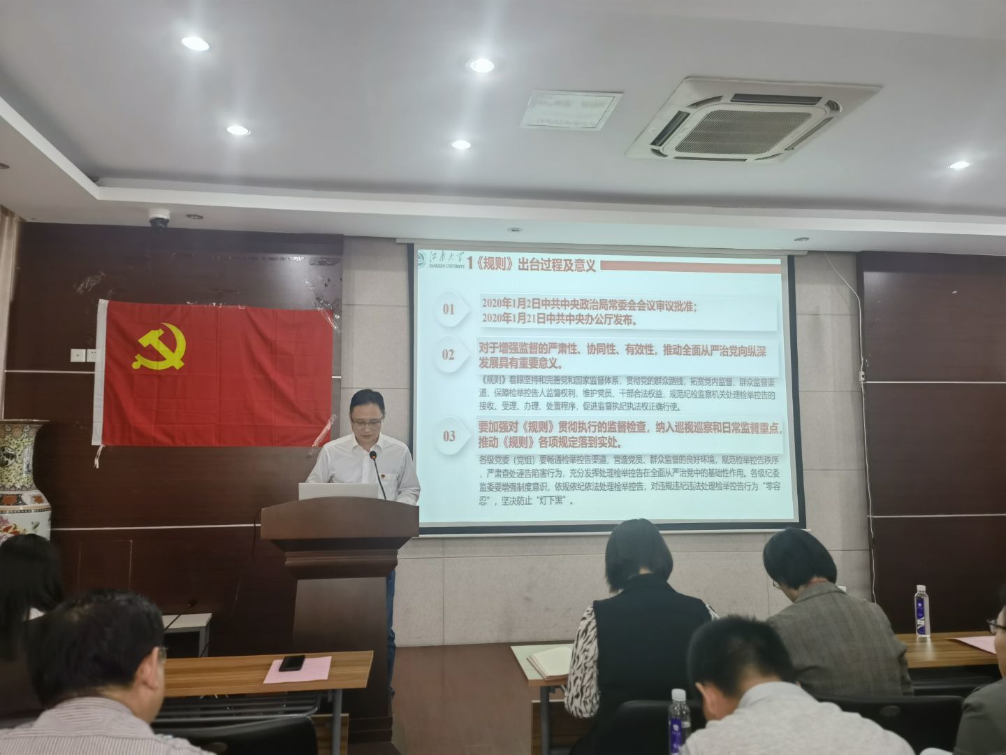 学院党委纪委委员邹华就《纪检监察机关处理检举控告工作规则》做了详细介绍。他说,处理检举控告,是我们党倾听党员和群众呼声、依靠人民群众开展反腐败工作的重要方式,是纪检监察机关贯彻党的群众路线、保障党员民主权利的重要举措;《规则》将坚持和加强党的统一领导作为根本政治要求,营造党员和群众监督的良好环境;要充分发挥处理检举控告在全面从严治党中的基础性作用,提倡鼓励实名检举控告、严肃查处诬告陷害行为、依规依纪依法处理检举控告。他指出,依据《规则》,开展常态化监督,落实党要管党,全面从严治党要求。