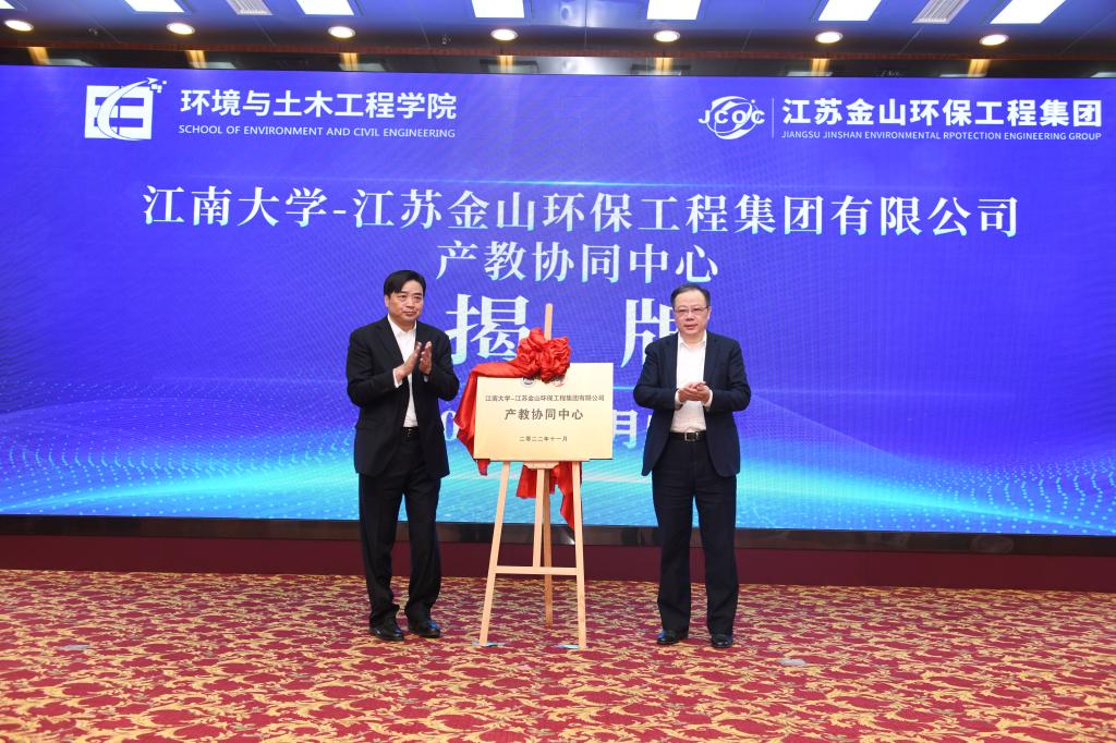 会上,朱庆葆与钱盘生共同为江南大学-江苏金山环保工程集团有限公司产教协同中心揭牌。