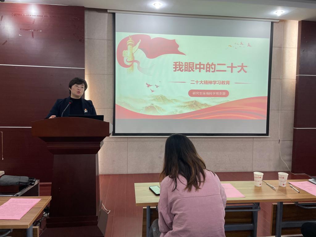 严普认为党的二十大是今年党和国家政治生活最重要的一件事,受到国内国际广泛关注,我们需要深入学习贯彻党的二十大精神,深刻理解党的二十大报告,从自身做起,担负起新时代的重任。研究生环境科学党支部书记王芮引用党的二十大报告中的环境论述,详细讲解了新时代高质量发展方式的绿色转变,要尊重自然,顺应自然,保护自然,加快发展方式绿色转型。支部宣传委员季亚卉从坚守党员初心,时刻进行自我革命角度,强调入党是需要我们用一生去践行党员标准的过程。各年级代表也将自己关于党的二十大精神学习成果向大家进行了分享。分享交流后严普带领支部党员进行了党的二十大报告论述知识问答并阐述问题背后的内在含义。