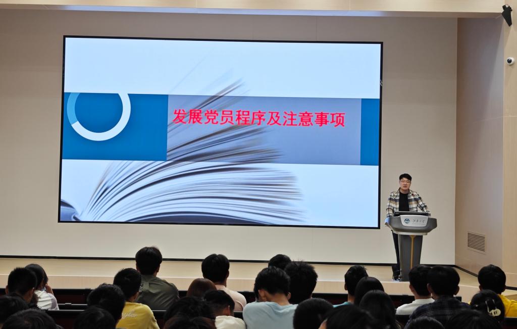 开班仪式结束后,学院学工办主任兼分团委书记薛羚伟为学员们带来开班第一讲,主题为发展党员流程及注意事项。他从全校党员总体情况来进行介绍,详细阐述了发展党员工作实施细则,并再三叮嘱学员们要把政治标准作为严格自身的首要标准。薛羚伟老师指出,学员们要珍惜积极分子培训学习机会,认真学习党的基本理论和基本知识;端正入党动机,树立立党为公的思想和观念;加强自我修养,努力提高思想道德境界。