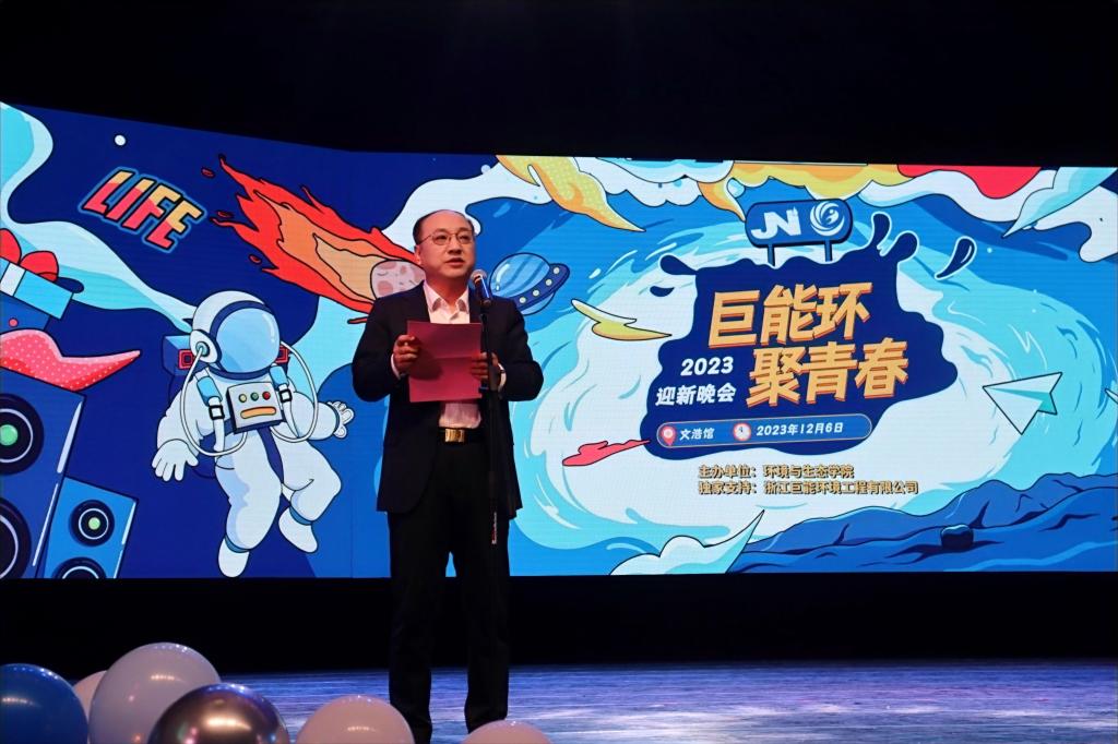 王震宇为晚会致辞,他代表学院全体教职工,热烈欢迎来自五湖四海的2023级新同学来到环境与生态学院。他对新同学提出了两点期望:一是希望同学们树立生态文明理念,参与国家生态文明的建设,将时代的重任与自己的专业相结合;二是希望同学们坚持知行合一精神,以知促行,以行求知,坚持知行合一,求得真学问。